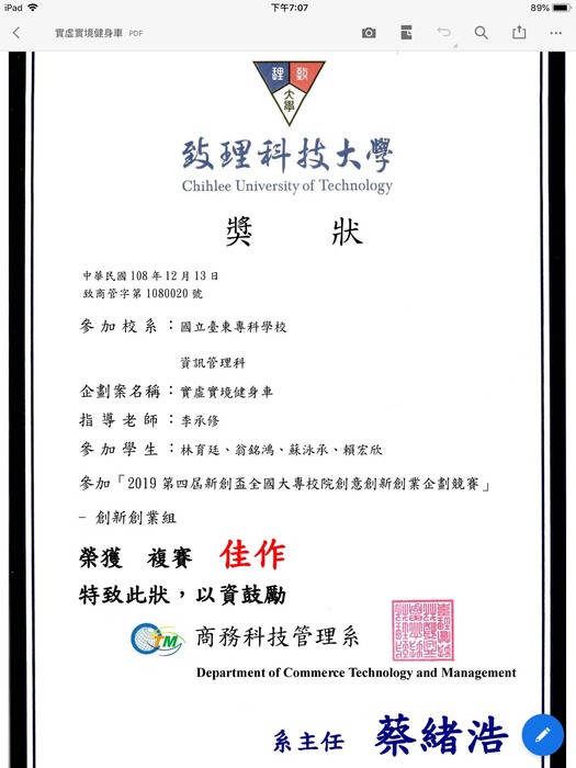 2019第四屆新創盃全國大專校院創意創新創業企劃競賽榮獲佳作