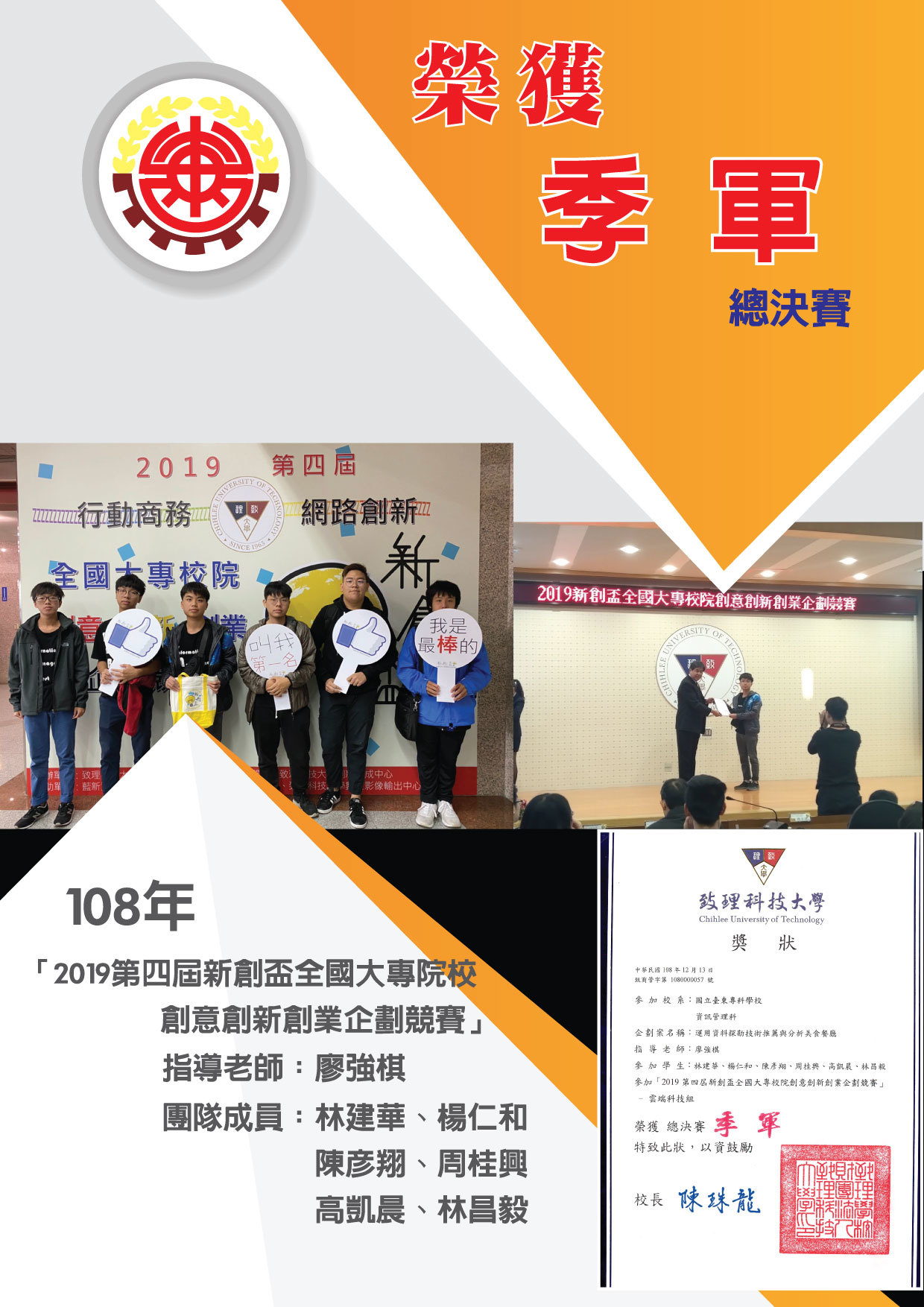 「2019第四屆新創盃全國大專院校創意創新創業企劃競賽」 榮獲總決賽季軍