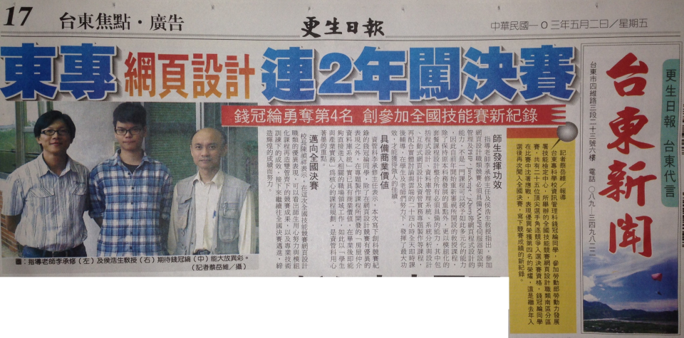 東專資管科全國技能競賽網頁設計職類連續兩年闖入全國決賽
