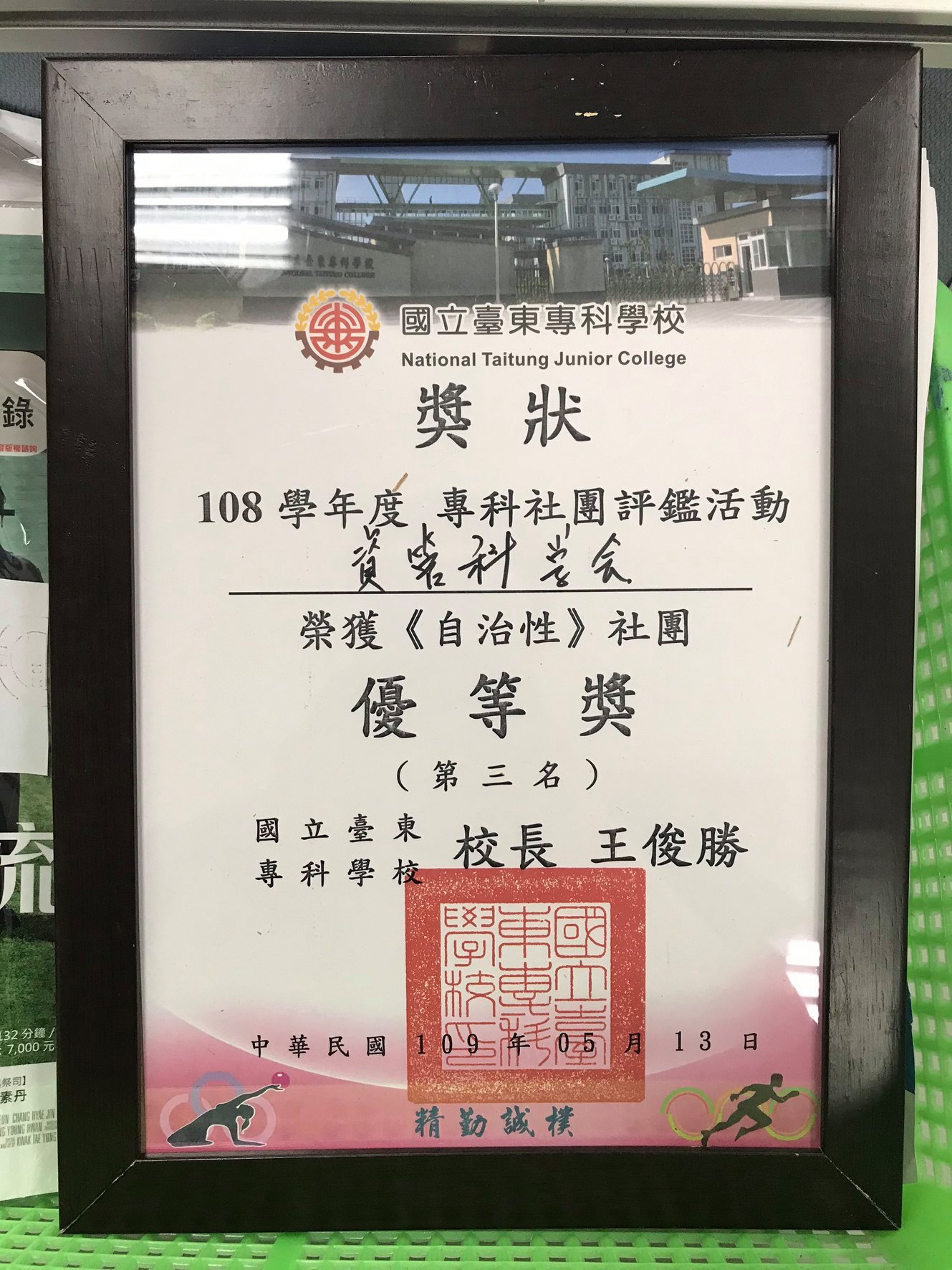 108學年資管科科學會榮獲專科社團評鑑優等獎